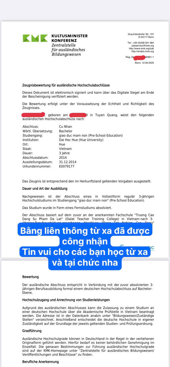 Đối với hàng ngàn bạn trẻ Việt Nam ấp ủ ước mơ sang Đức làm việc và sinh sống, có một rào cản vô hình nhưng vô cùng lớn: vấn đề xác nhận văn bằng. Trong nhiều năm qua, quy trình xin xác nhận (hay còn gọi là Anerkennung) cho các loại bằng cấp không chính quy như bằng đại học liên thông, đại học từ xa hay đại học tại chức luôn là một thách thức, thậm chí là điều bất khả thi. Các cơ quan chức năng của Đức thường rất khắt khe trong việc công nhận giá trị của những văn bằng này, khiến nhiều hoài bão bị dang dở ngay từ bước đầu tiên.